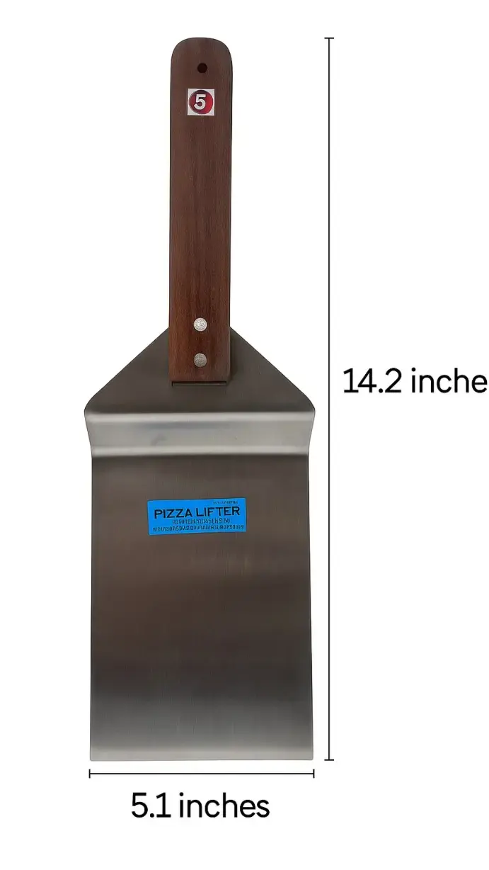 This 14.2-inch Pizza Lifter is crafted for perfect control and power during high-volume baking. Designed with a solid wooden handle and wide stainless steel blade, it easily lifts pizzas, pies, and heavy bakes without buckling or sliding. At 5.1 inches wide, this lifter provides a broad surface ideal for large pizzas, heavy cakes, or deep-dish pies. The ergonomic grip ensures better balance while keeping your hands away from high oven heat. A trusted essential for bakeries, pizza outlets, commercial kitchens, and bulk food production. Height: 14.2 inchesWidth: 5.1 inchesWide blade for stronger grip and supportPremium stainless steel constructionSturdy wooden handle with rivet reinforcementPerfect for large or heavier baked goodsIdeal for bakeries, restaurants & cloud kitchensMinimum order quantity: 3 piecesModel Number: BT259