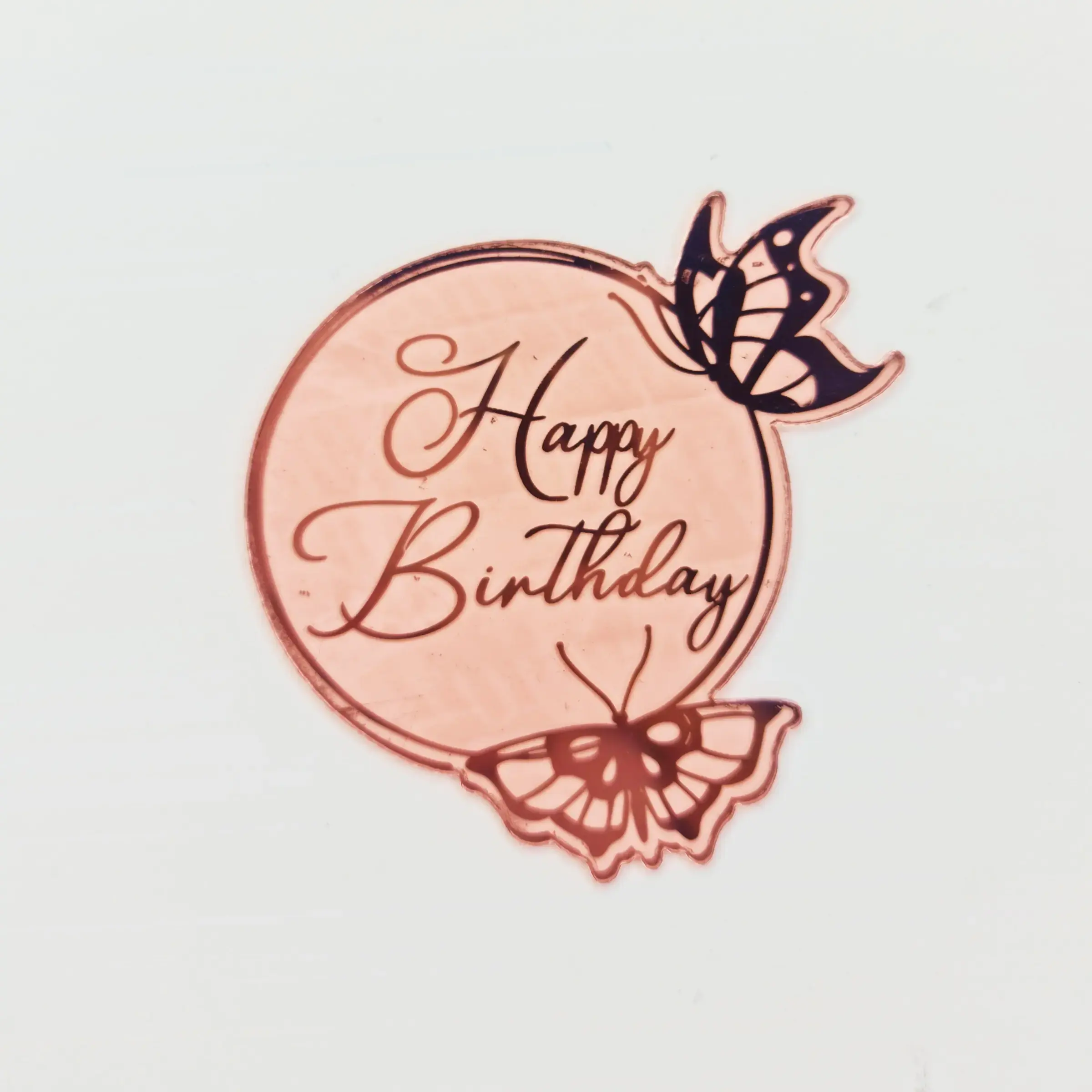 Rose Gold Round Happy Birthday with Small Butterfly Acrylic Tag (100-piece pack) packets TPR122-1