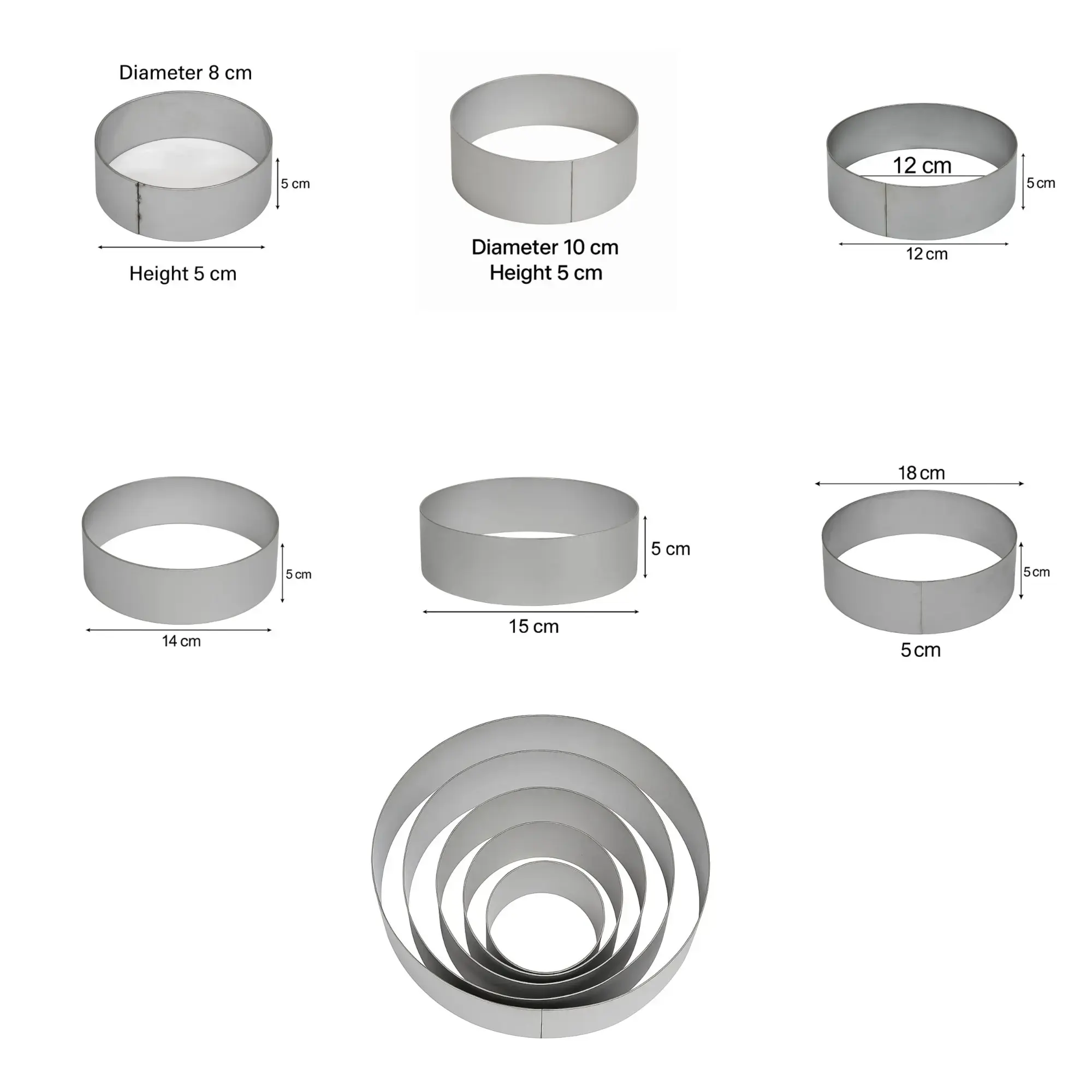 Model Number: BT252Set of 6 Ring MoldsAvailable Diameters: 8 cm (3 inches),10 cm (4 inches),12 cm (5 inches),14 cm (6 inches),15 cm (7 inches),18 cm (8 inches)Height: 5 cm (approx. 2 inches)Ideal for mousse, sponge, and layered cakesDurable stainless steel constructionEasy to clean and reusableMinimum Order Quantity: 3 pieces